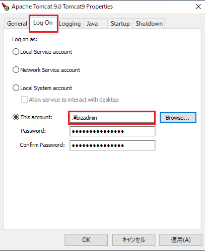 Apache Tomcat 起動ユーザ名の指定方法については、お客様ご利用環境の Apache Tomcat の設定方法をご確認ください。(以下は Windows 環境の Apache Tomcat 9.0 の例です)