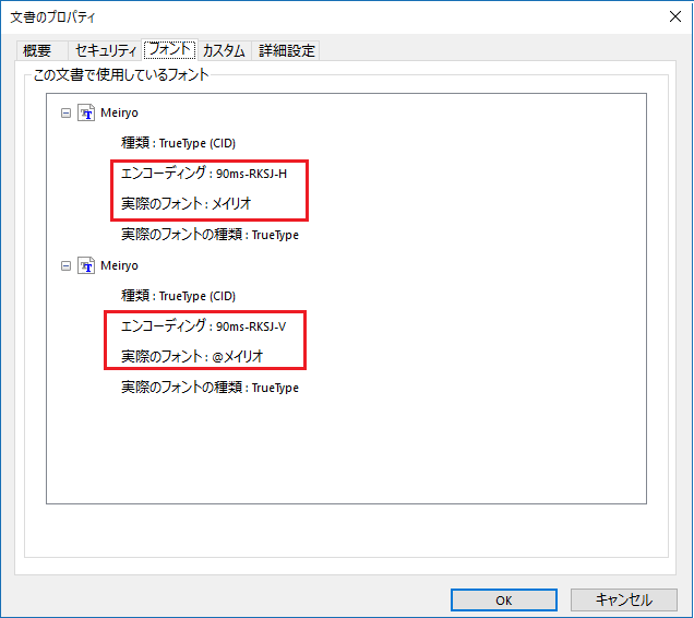 生成したPDF ファイルのフォント情報で、エンコーディングと、実際のフォントが正しいことを確認してください。